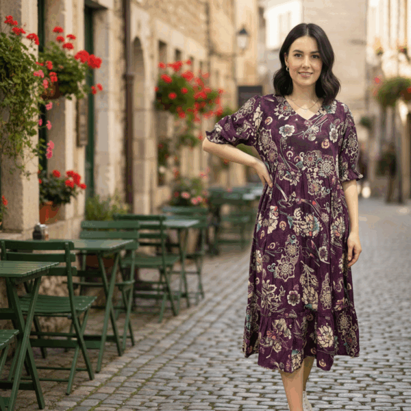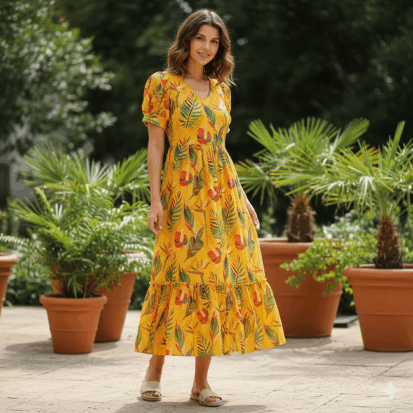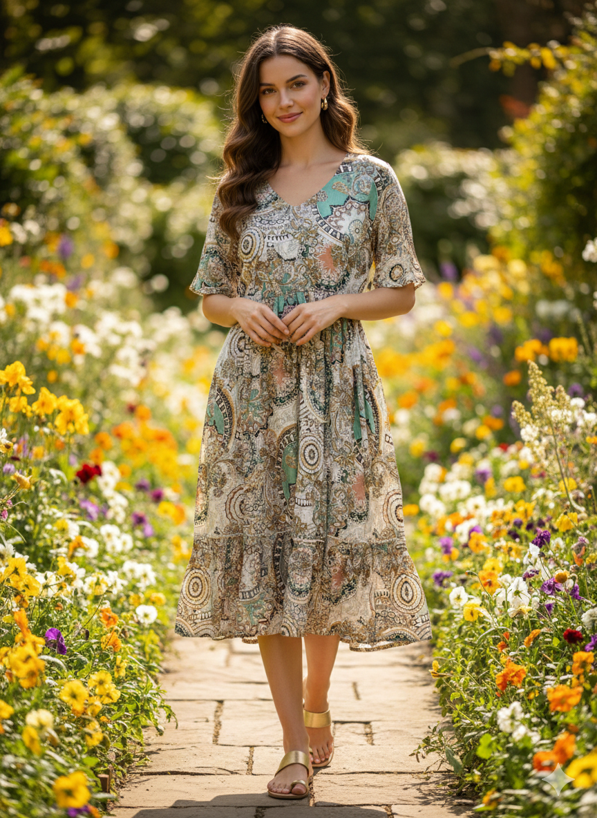 Designed with a flattering V-neckline and delicate flutter sleeves, it creates a feminine and timeless silhouette. The intricate paisley-inspired print in earthy tones adds refined charm, making it ideal for brunches, festive gatherings, vacations, and special daytime occasions.