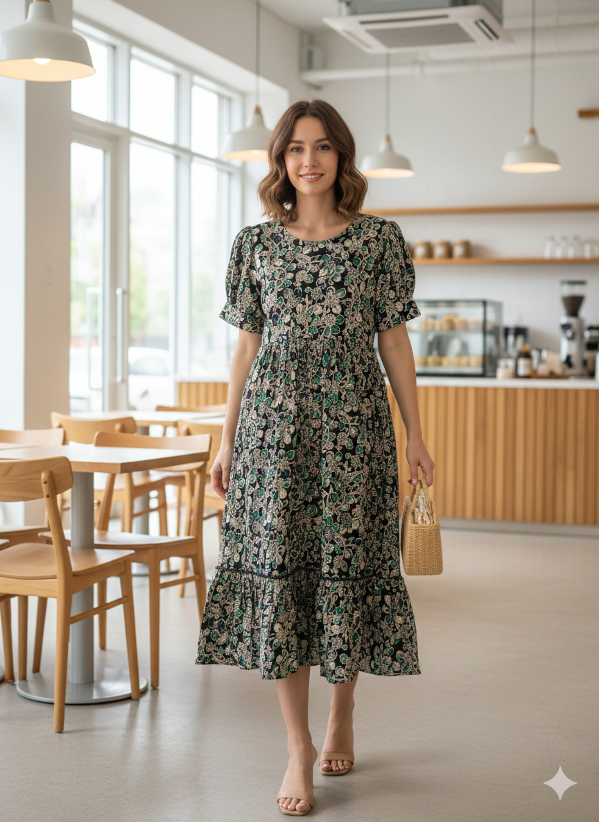 Step into timeless comfort with this cotton Kalamkari frock featuring an intricate all-over vine and floral motif on a classic midnight-black base. Crafted in soft, breathable 100% cotton, it’s ideal for long days, travel, and easy casual styling. The dress comes with a round neckline and short sleeves, while the gently gathered waist creates a flattering shape without compromising comfort. Finished with a tiered hem, it adds graceful movement and a relaxed, airy feel. Pair it with flats and minimal jewelry for everyday chic, or elevate it with oxidised earrings for a festive ethnic-fusion look.