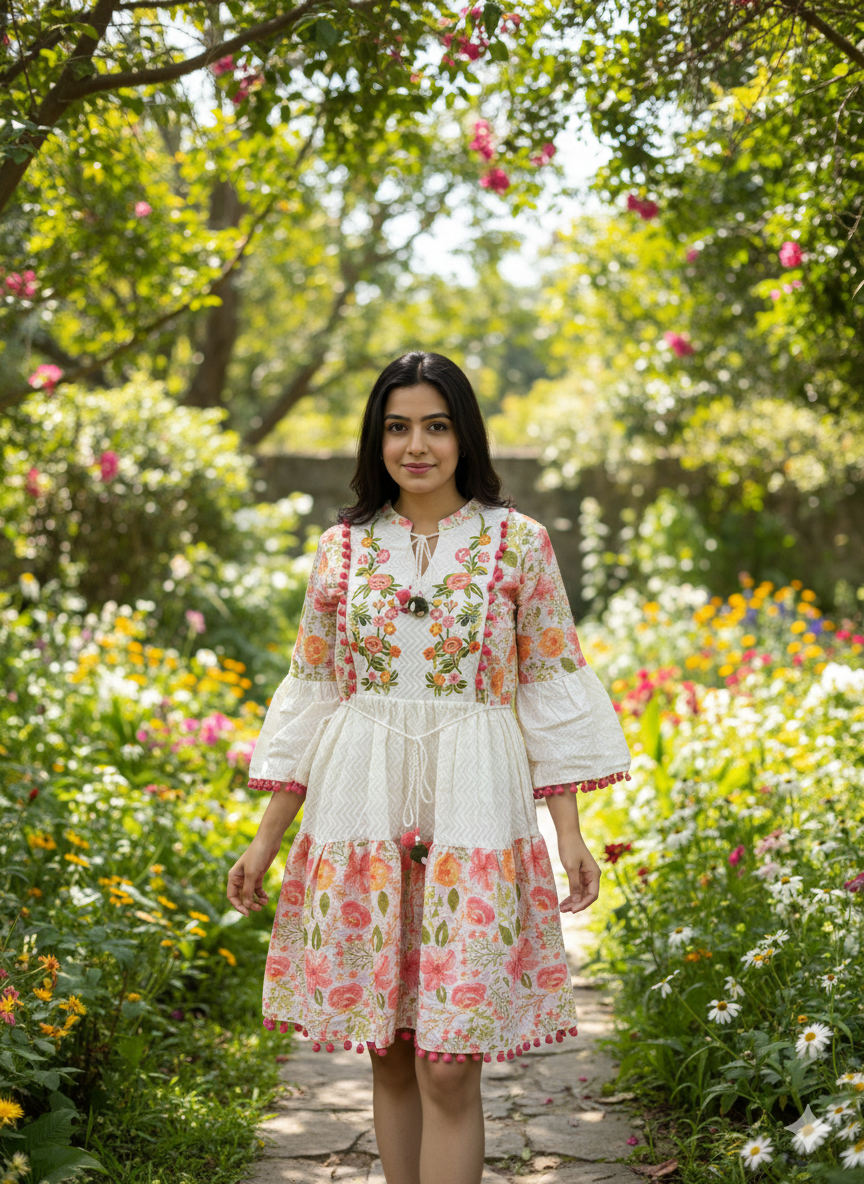 Step into effortless summer charm with this mul cotton tunic dress in a soft ivory base and fresh garden florals. The embroidered-look yoke adds a handcrafted feel, while the tie-up tassels at the neckline give it a relaxed, boho finish. Designed with 3/4th bell sleeves, a comfort-fit waist, and a tiered silhouette, it’s perfect for daytime outings, brunches, or vacation strolls. The look is completed with pom-pom lace detailing on sleeves and hem for that extra cuteness.