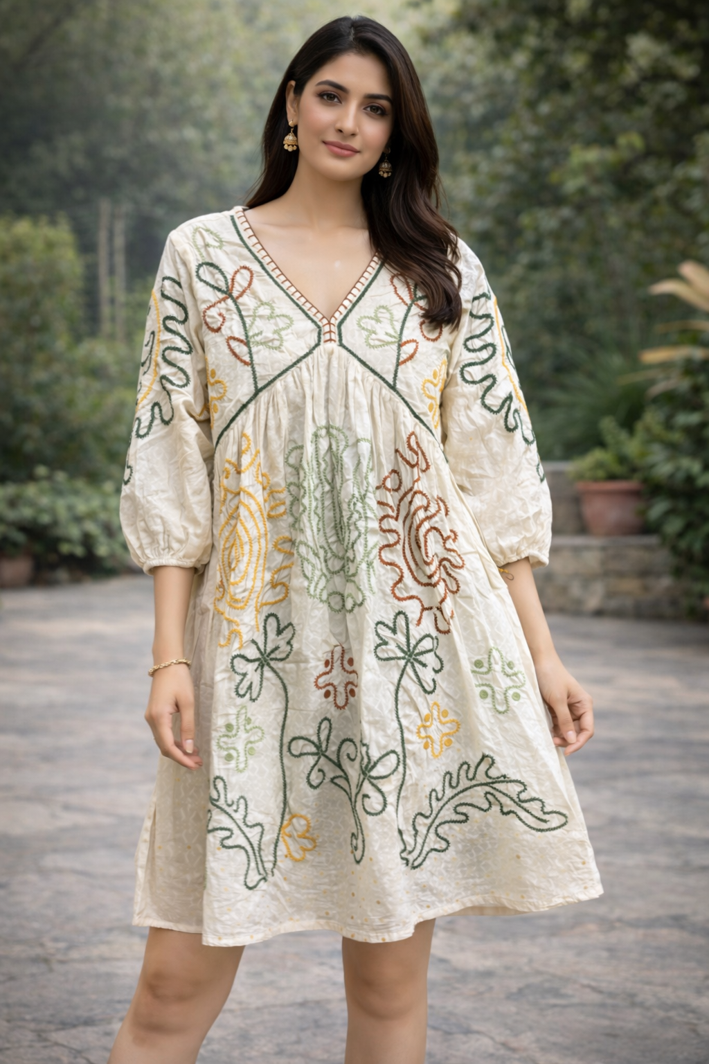 Add effortless charm to your everyday wardrobe with this mul cotton tunic dress crafted in a soft ivory base and highlighted with colorful folk-style embroidery all over. Designed with a deep V-neckline featuring contrast edging, it flows into a relaxed, gathered silhouette that feels airy and flattering. The 3/4 balloon sleeves with elasticated cuffs add volume and comfort, making it perfect for brunches, casual outings, holidays, or work-from-anywhere days. Style it with flats for daywear or dress it up with statement earrings for a chic look.
