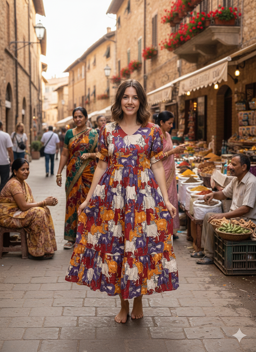Add a touch of heritage charm to your wardrobe with this Kalamkari Pichwai print cotton frock. Crafted in breathable cotton, it’s perfect for all-day comfort while making a statement with its traditional-inspired motifs in rich earthy shades. The V-neckline gives a flattering shape, the short puff sleeves add a feminine look, and the gathered waist offers a relaxed fit with beautiful fall. Finished with a tiered skirt, this frock moves gracefully—ideal for casual outings, festive daytime wear, travel, and weekend plans. Style it with juttis or flats and oxidised jewellery for an elegant ethnic-fusion look.