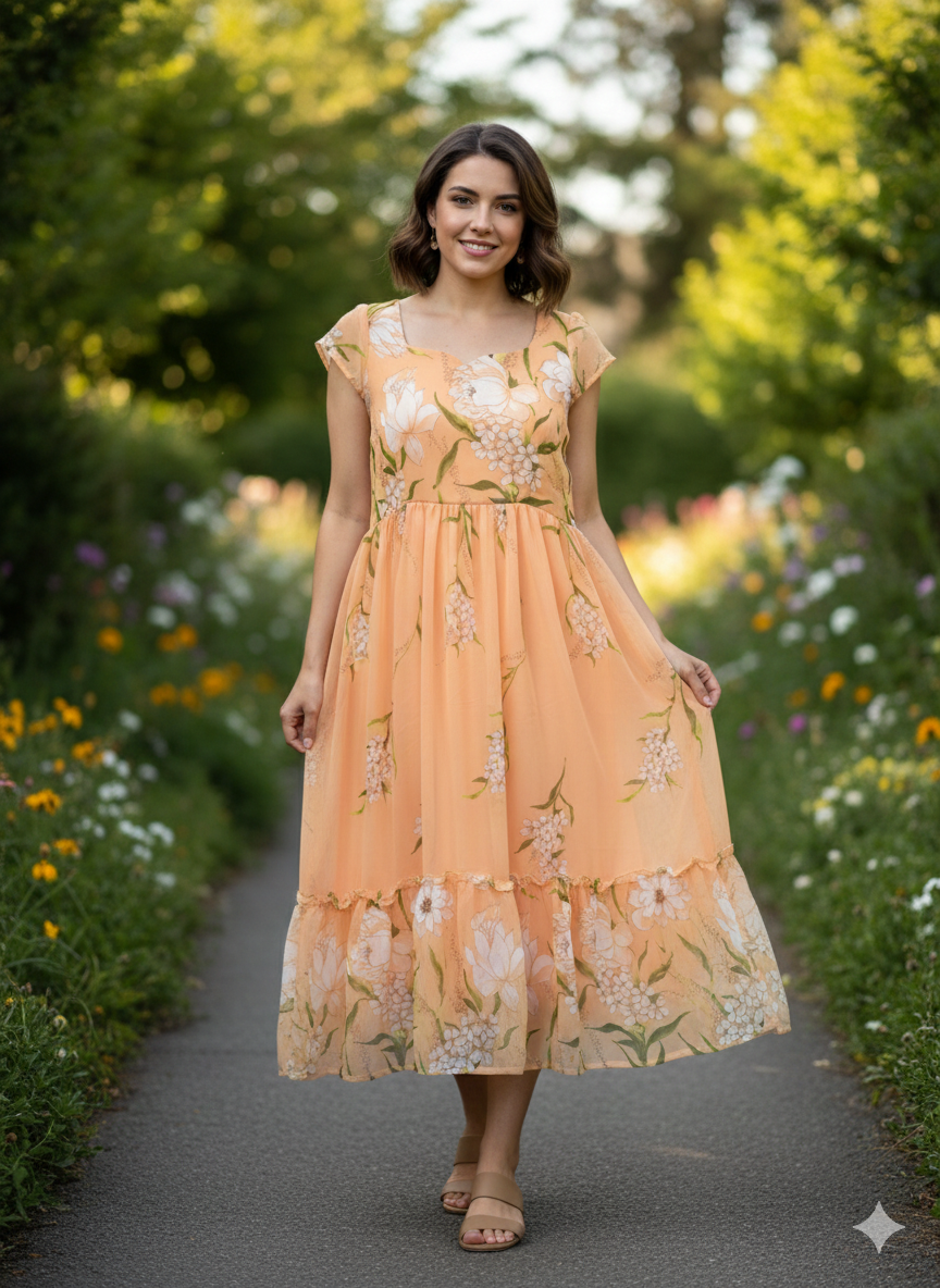 Bring effortless elegance to your daywear with the Peach Meadow Floral Georgette Tiered Midi Frock. Crafted in lightweight georgette, this frock features a delicate all-over floral print on a warm peach base. The structured bodice with a gently defined waist creates a flattering shape, while the airy skirt flows beautifully with every step. Finished with a wide printed border and a soft ruffled tier at the hem, it’s ideal for brunch, vacations, picnics, and casual celebrations. Style it with flats for an easy daytime look or dress it up with heels and minimal jewelry.
