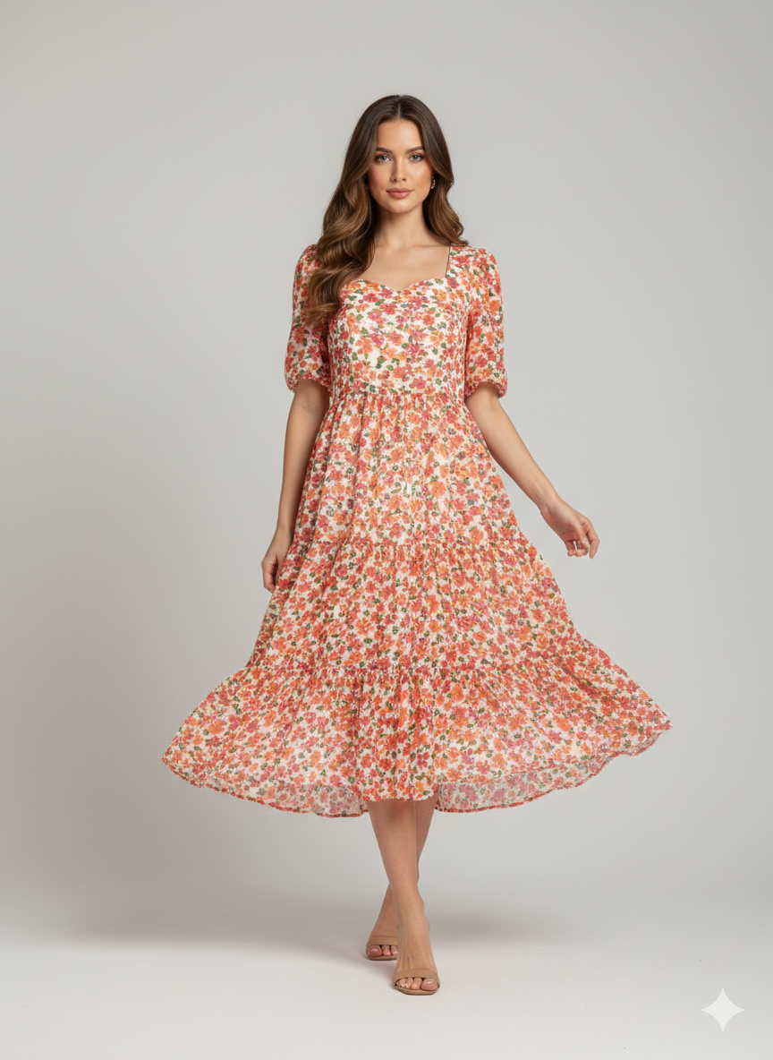 A romantic floral georgette midi frock with a sweetheart neckline, puff sleeves, and a flowy tiered skirt—lightweight, feminine, and perfect for day-to-evening wear.