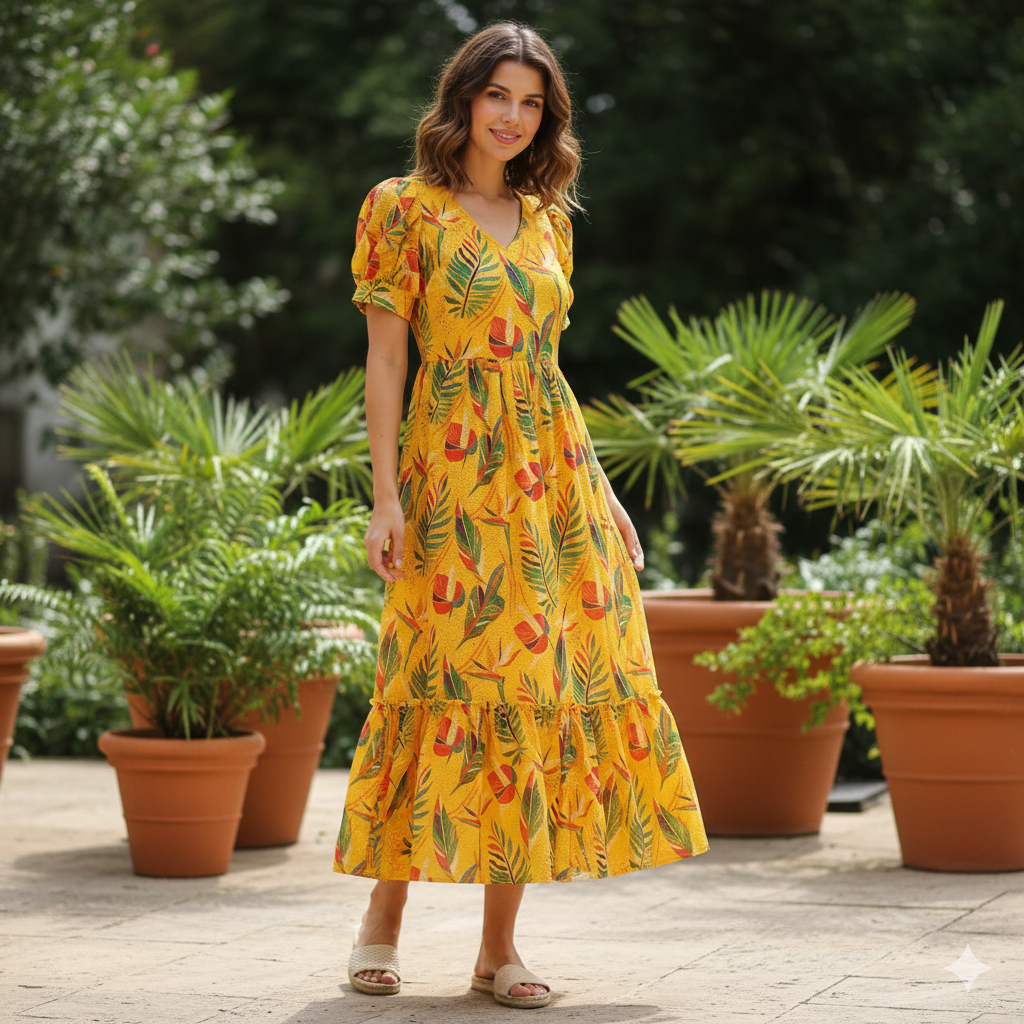 Fresh, fun, and effortlessly stylish—this Kota frock features a vibrant tropical leaf and abstract print on a warm mustard-yellow base. The V-neckline adds a flattering touch, while the short puff sleeves keep the look soft and feminine. A gathered waist gives a comfortable fit and shape, and the tiered flared skirt creates beautiful movement with every step. Lightweight and breathable, it’s perfect for daily wear, travel, brunch, and summer outings. Pair it with sandals and a sling bag for an easy, chic look.